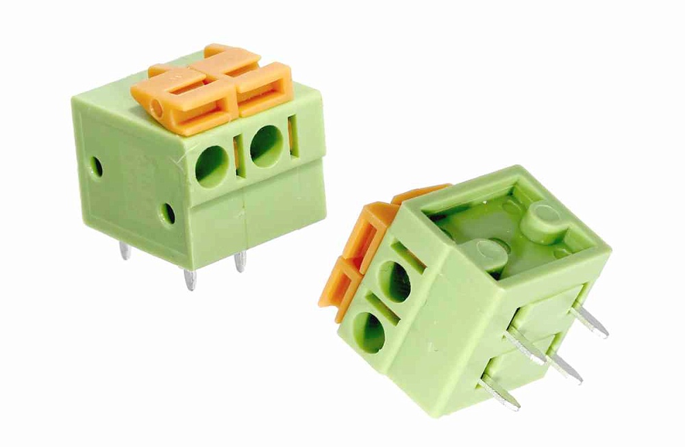 Клеммный блок угловой для пайки на плату с защитой провода. Количество контактов 2. Зажим провода пружинный. Диаметр провода от 22 до 16 AWG. Напряжение и ток: UL 300VAC, 10A; IEC 250VAC, 15A. Выводы латунные лужёные оловом. Материал корпуса PA66 (UL 94V-0) зелёного цвета.