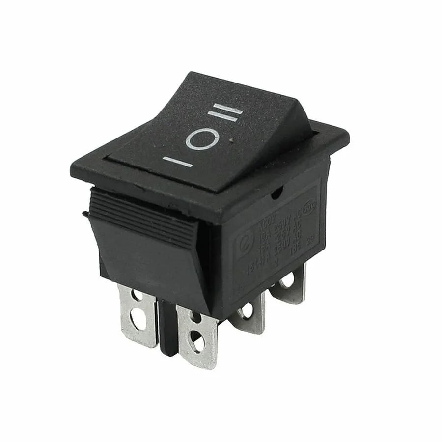 Сдвоенный сетевой клавишный выключатель 16А 250В на три положения. Схема работы ON-OFF-ON. Цвет корпуса чёрный, цвет клавиши чёрный. Клавиша без подсветки.